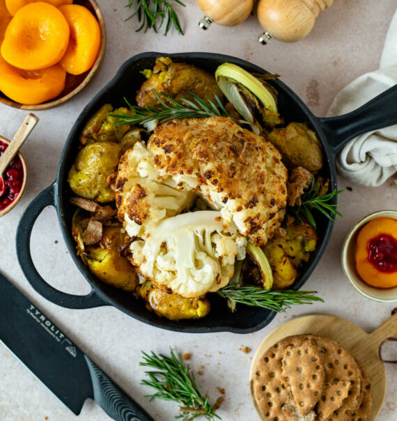 Dass die vegane Küche nicht nur superlecker, sondern auch spannend sein kann, zeige ich euch heute! Wir kochen einen Karfiolbraten mit Quetschkartoffeln. Ein Braten kommt selten allein! Wenn es bei