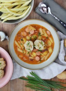 Ich habs meinen Kindern unter dem Namen „Dschungel Gulasch“ verkauft. Schließlich schwimmen in der Suppe jede Menge Lianen 🙂 also Fisolen. Zugegeben etwas skeptisch waren die beiden sehr wohl, aber