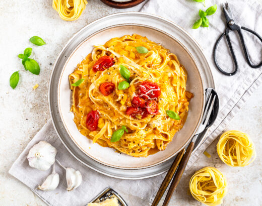 Kürbis-Fans aufgepasst! Herbstliches Rezept für eine cremige Kürbis Pasta aus dem Backofen. Schnell und einfach zubereitet!
