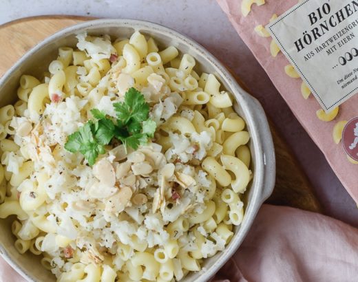 Na, schon mal Karfiol-Carbonara mit gerösteten Mandeln gekocht? Wenn nicht, wird es höchste Zeit! Super lecker, ich versprechs euch! Cremige BIO Hörnchen mit frischem Karfiol, knusprigen Speckwürfeln und gerösteten Mandeln,