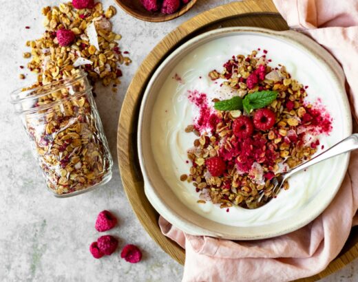 Knuspriges Granola steht bei uns regelmäßig auf dem Plan. Neben der Basis Mischung gibts bei uns ganz oft Haselnuss oder Kakao Granola. Was noch fehlt ist also eine fruchtige Variante.
