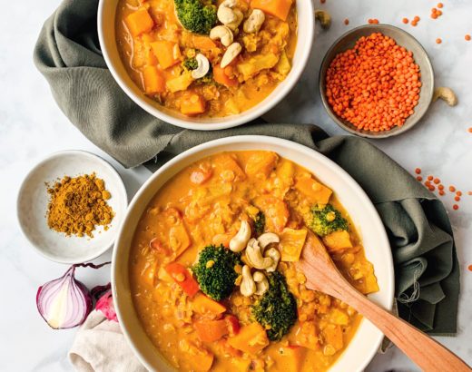 Ich hab’s endlich geschafft. Hier ist mein Linsen-Curry mit Kürbis und Brokkoli!