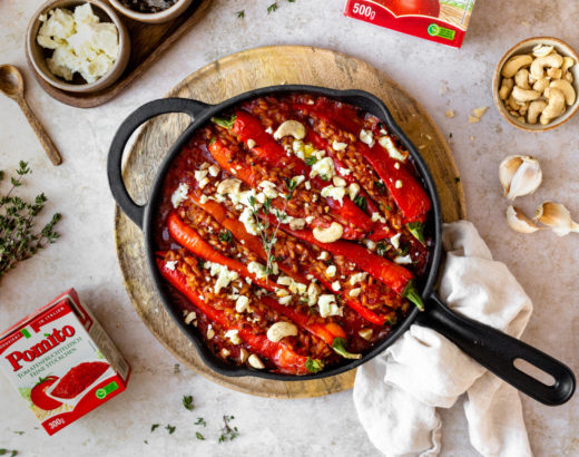 Vegetarisch gefüllte Paprika mit Dinkelreis in einer fruchtigen Tomatensauce lassen unsere Herzen höher schlagen. Wir füllen unsere Spitzpaprika mit Dinkelreis, Kräutern und Feta Käse und zaubern so eine gesunde Portion Soulfood
