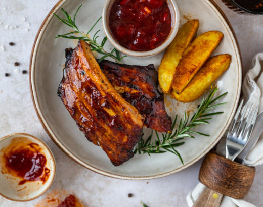 Knusprig, saftig, würzig so kommen meine Spareribs mit Curry-Rosmarin-Kartoffeln aus dem Backofen. Dazu gibts eine kräftige Sauce mit Paprika zum tunken!