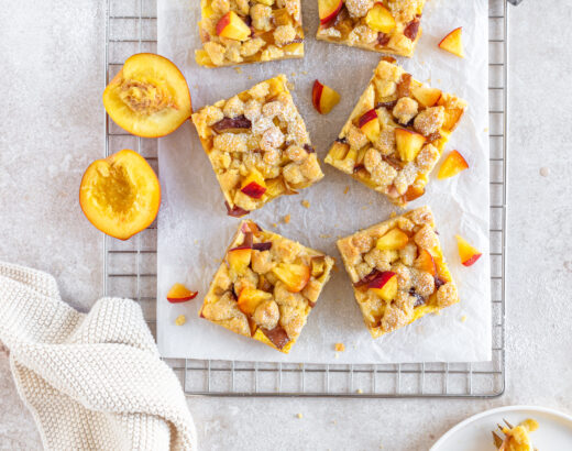 Pfirsich-Träumchen gefällig? Dann probiert gleich meinen leckeren Pfirsich Streuselkuchen mit Vanillepudding!