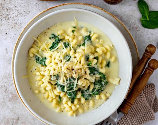 Wenn es in der Küche schnell gehen muss, aber dennoch etwas Leckeres und Gesundes auf den Tisch soll, sind Kürbis-Scherennudeln mit Spinat die perfekte Lösung!