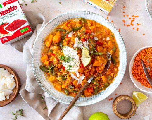 Mhmm wie das duftet! Heute kochen wir gemeinsam mit Pomìto einen cremig fruchtigen Süßkartoffel-Linsen-Eintopf! Süßkartoffelfans aufgepasst! Die Zeit, in die Süßkartoffel als Exot galt, ist längst vorbei und wir alle